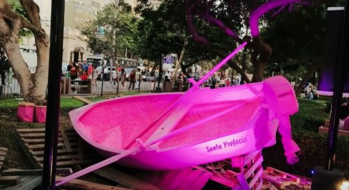 El objetivo de la intervención que propongo con la instalación de Santa Profecía, en el Parque Kennedy del distrito de Miraflores –– mal llamado distrito pituco ––, es hablar de la vigencia del miedo a que la profecía de una santa se haga realidad en la metáfora del terremoto y tsunami de tantas otras índoles, que prefiero no nombrar. No obstante, el espectador otorga a la obra artística múltiples miradas, que como artífice no puedo controlar. Del mismo modo y, tal vez, más importante, homenajear por asociación de ideas con el color rosa, a la Patrona de América ––proveniente de una familia notable de Lima –– que protege a los más pobres y enfermos de tuberculosis. La barca rosa ––color utilizado por mí en diferentes obras a modo de camuflaje––, es símbolo de esperanza, de viaje, de fuerza y valentía para enfrentar lo desconocido, como por ejemplo el tránsito entre Eros y Tánatos. Para el filósofo Gaston Bachelard, la barca es el símbolo que funciona como una cuna, que recuerda a la matriz y al seno materno, por lo que deducimos que simboliza el inicio de la vida y su viaje por el que transitamos con sus dificultades hacia el final de nuestra existencia.